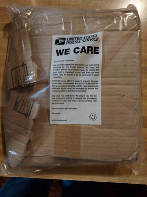Troy's friend Christina send us a gift and the post office didnt' treat it very nicely. God was watching over it and despite the damage to the package it is intact.